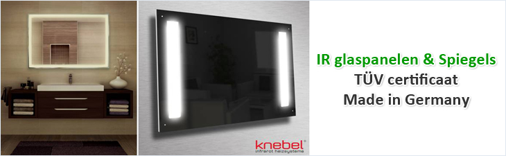 Een Knebel infraroodspiegel is een infrarood warmtepaneel met ESG spiegelglas in de uitvoeringen met of zonder LED verlichting. Met duurzame materialen en TÜV certificering voor een veilig gebruik in de vochtige badkamer. We werken met geavanceerde infrarood reflextechnologie die een strakke design spiegel combineert met effectieve energiezuinige verwarming. De Knebel infraroodspiegel wordt in Duitsland geproduceerd conform Tüv certificering. We leveren infraroodspiegels in vele maten t.b.v. uw gewenste vermogen en passend bij uw badkamermeubel.
